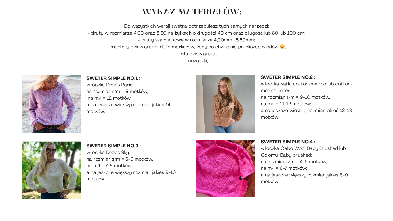 posiadają filmy instruktażowe, które krok po kroku przeprowadzą Cię przez cały proces dziergania aż 4 wersji swetra simple!